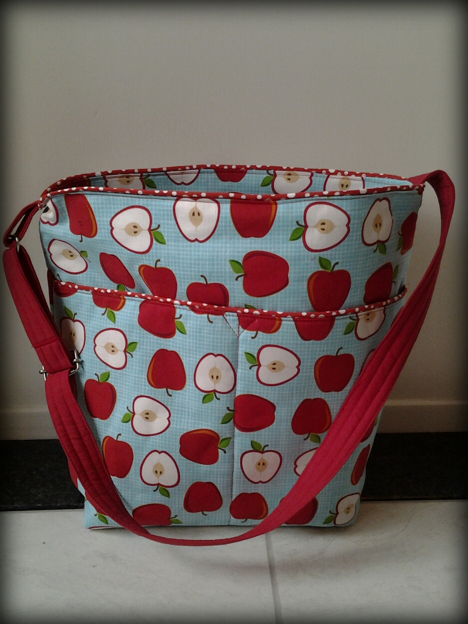 | Vóór de 'appeltjestas' was déze tas de dochter haar muziektas. Het leuke stofje met de muzieknoten, vond ik bij IKEA, het patroontje voor de tas bij Mme ZsaZsa. Het is haar laptoptas waar je best geen laptop in steekt :) |
